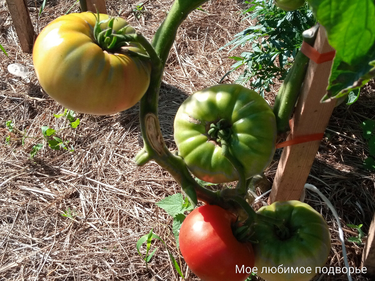 В средней полосе этот сорт рекомендуют выращивать в теплицах, я же в этом сезоне высадила один куст в ОГ, посмотреть, как он себя поведёт. Так он навязал таких "богатырей", что не помогли даже колья - рухнул вместе с ними. Правда, налиться помидоры на улице не успели, дозаривала дома. Лежат неплохо, вкус не теряется, что мало присуще розовым сортам.